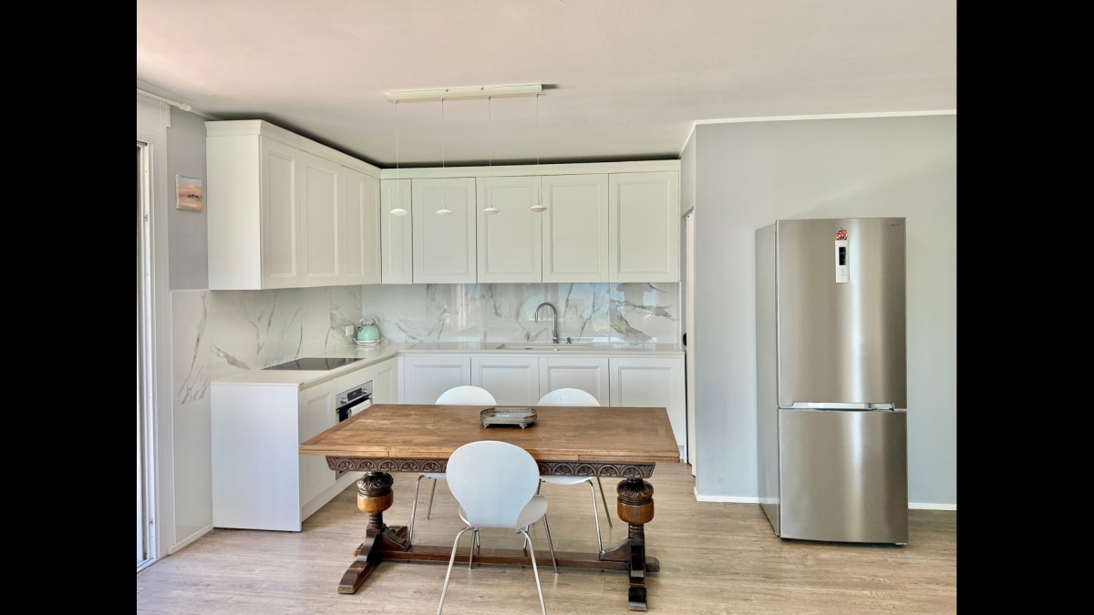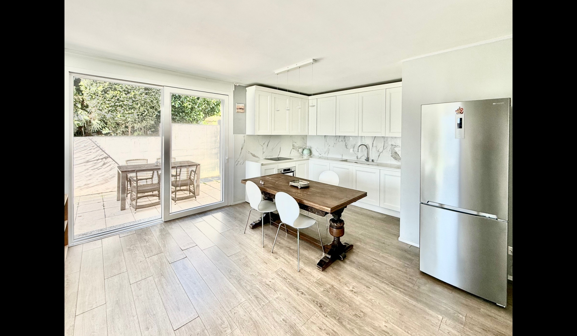 Sala da pranzo-cucina open space con accesso diretto al giardino e all’ampia terrazza/pergola.