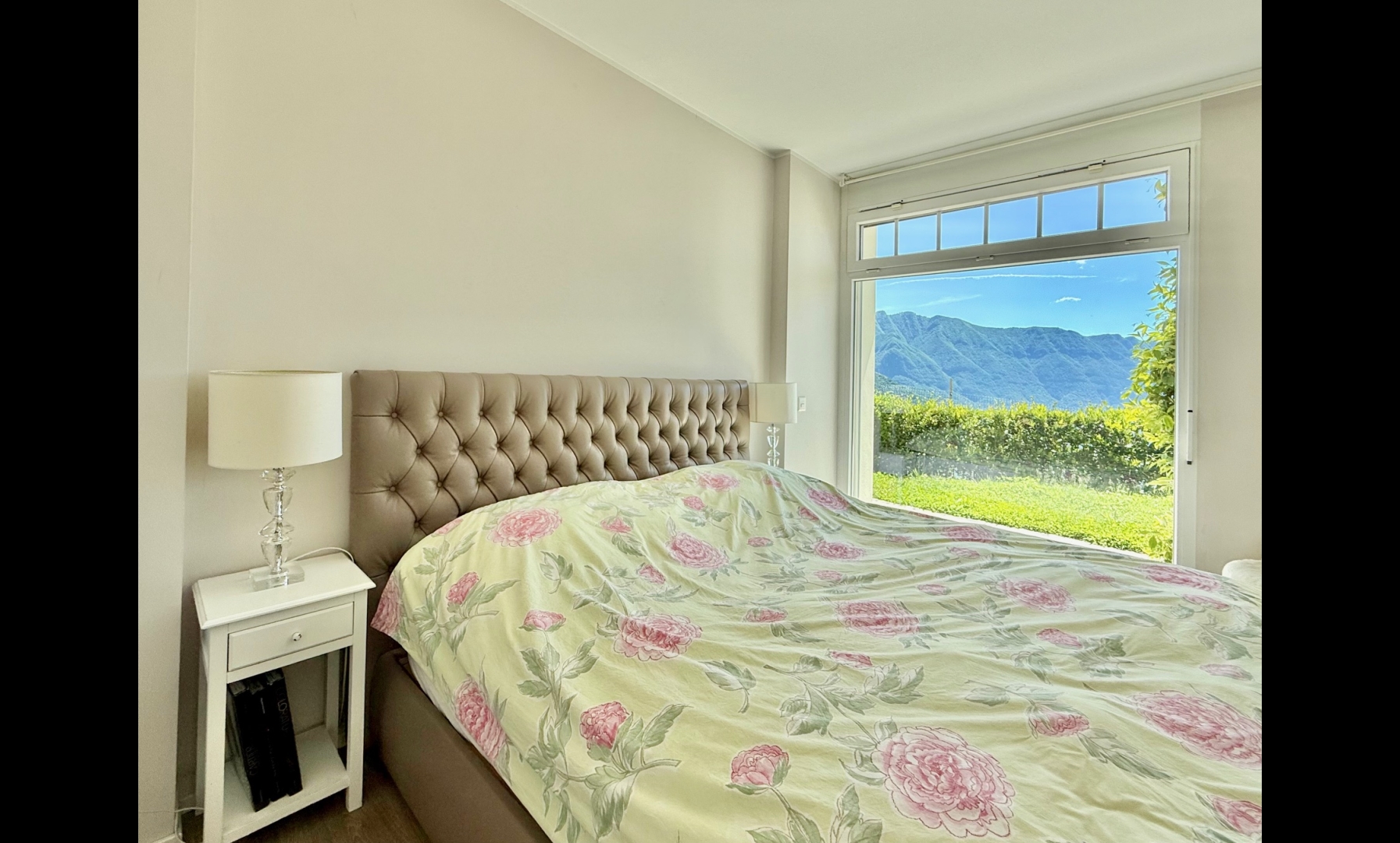 Camera da letto con grande finestra panoramica con magnifica vista sul giardino e sul lago