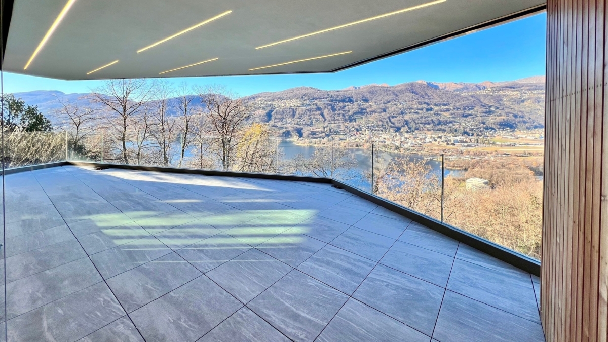 La moderna residenza confina con una superficie boschiva la quale garantisce massima privacy e vista aperta sul lago e montagne.